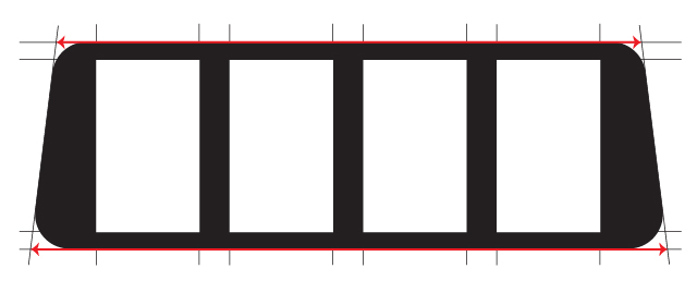 Typical frame decals corresponding to the panel illustrations above are shown below, complete with cutting and aperture position guides. The latter are to help you position the character decals rather than cut out the apertures from the frame decals. They will therefore need to be transferred to the support with appropriate markings. The red arrows show the minimum and maximum dimensions you will need to specify for frames with horizontal and/or vertiacl tapered edges.