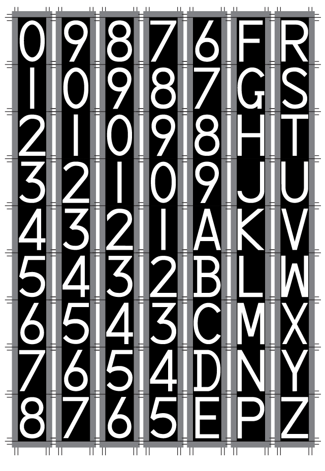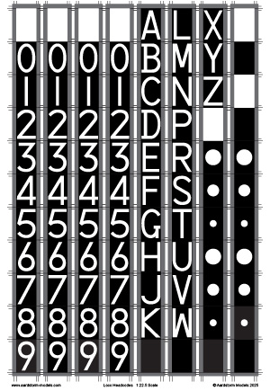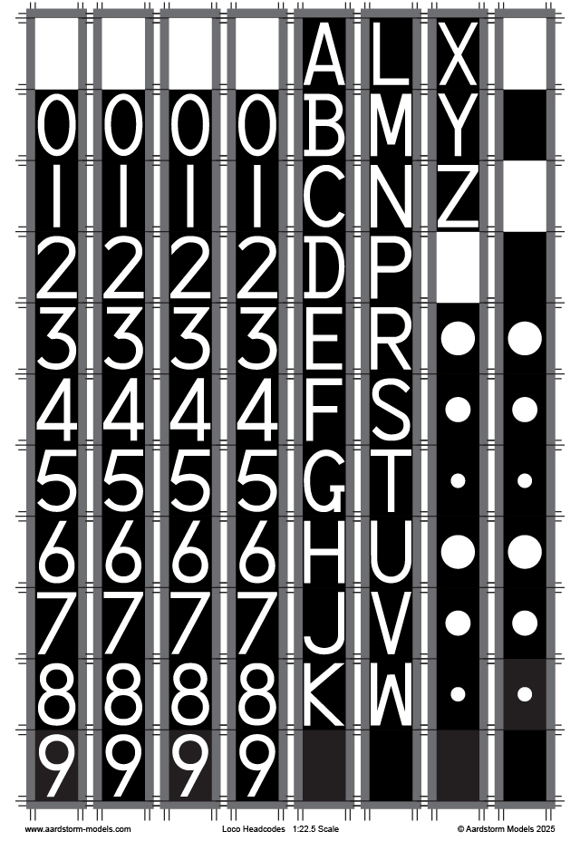 The shapes of the numbers and most of the letters are taken from photographs of real headcodes. The letters I, O, and Q are omitted from the sets, because of potential confusion with the numbers 1 and 0. I have also included some letters for which I have no photographic evidence: R, U, W, and Y. Their shapes therefore may not be accurate, and they may not have been included in the real headcode sets anyway.