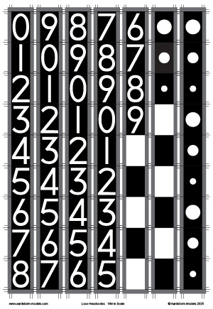 The individual character decals are arranged in closely-spaced vertical strips to allow mis-aligned characters (as shown above) to be modelled easily. Four different sheet layouts are available, depending on your chosen scale, three of which are illustrated here:
