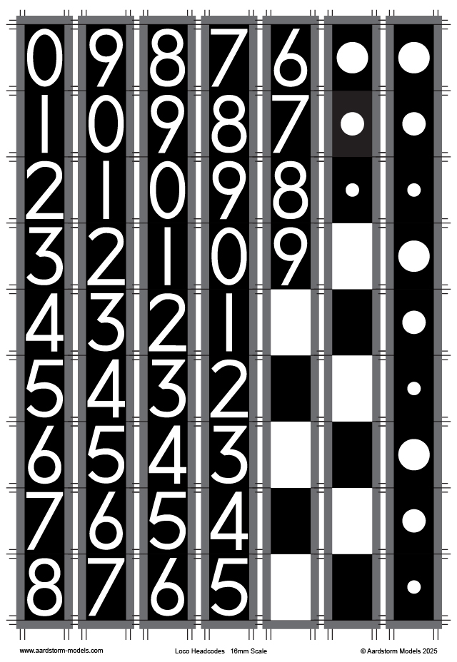 The joints between adjacent headcode decals will be visible through the headcode panel front glass, especially if the apertures are quite widely spaced. A frame is therefore needed between the glass and the character decals to hide these joints, and provide a better representation of the the construction of the real panel. In the larger scales this frame is probably best implemented using a sheet of thin material such as plastic sheet, with the appropriate aperture holes cut in it and painted matt black. For the smaller scales, or if you so choose, I can also provide a frame implemented as further decals, printed onto a sheet with transparent backing, such that the aperture holes are transparent for the characters to show through. Depending on your chosen scale, at least 4 identical frame decals will be provided on each sheet, configured to your specification.