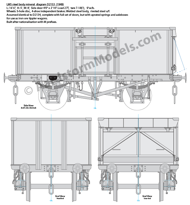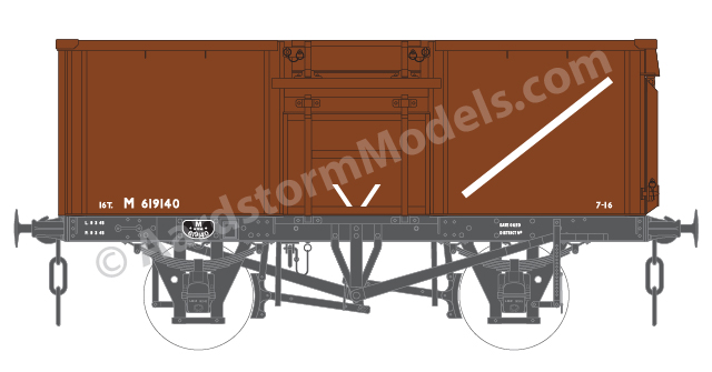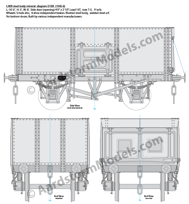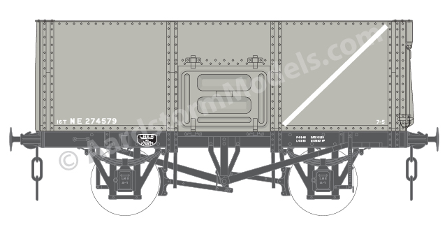 This page describes the scale drawings I have available for you to produce models of all-metal railway wagons that were used to carry minerals such as coal for the commercial customers of the railway companies. The wagons on this page were designed and built by the LMS and LNER after World War II. Many of the LMS wagons weren't delivered until after nationalisation. Similar wagons for other periods are covered by separate pages. This page covers those wagons with the traditional rectangular body shape, similar wagons with wooden bodies, and hopper wagons, will also be covered by separate pages.