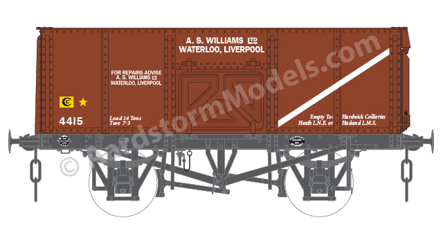 In 1949 the last of the batch of wagons to LMS D2143 were completed with stronger springs and axleboxes for use as 27T iron ore tipplers, to LMS diagram D2153. These wagons had the full complement of doors of the standard D2134 design.