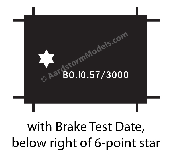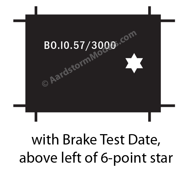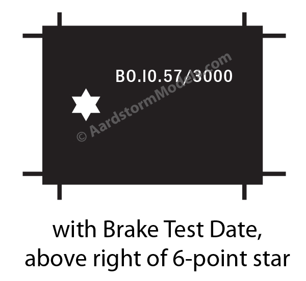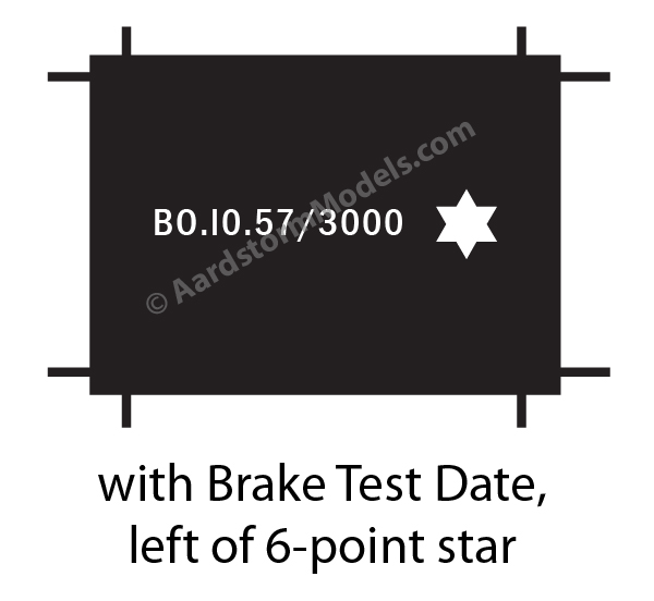 There were undoubtedly others; if anyone has authoritative information I'll gladly add them to this list. The position of the test date relative to the star was subject to considerable variation, as shown above. With the arrival of the new British Rail corporate image around 1964, the maintenance information on wagons (including the brake test date) was moved to a standardised table painted on the wagon body. The star remained on the solebar on its own.